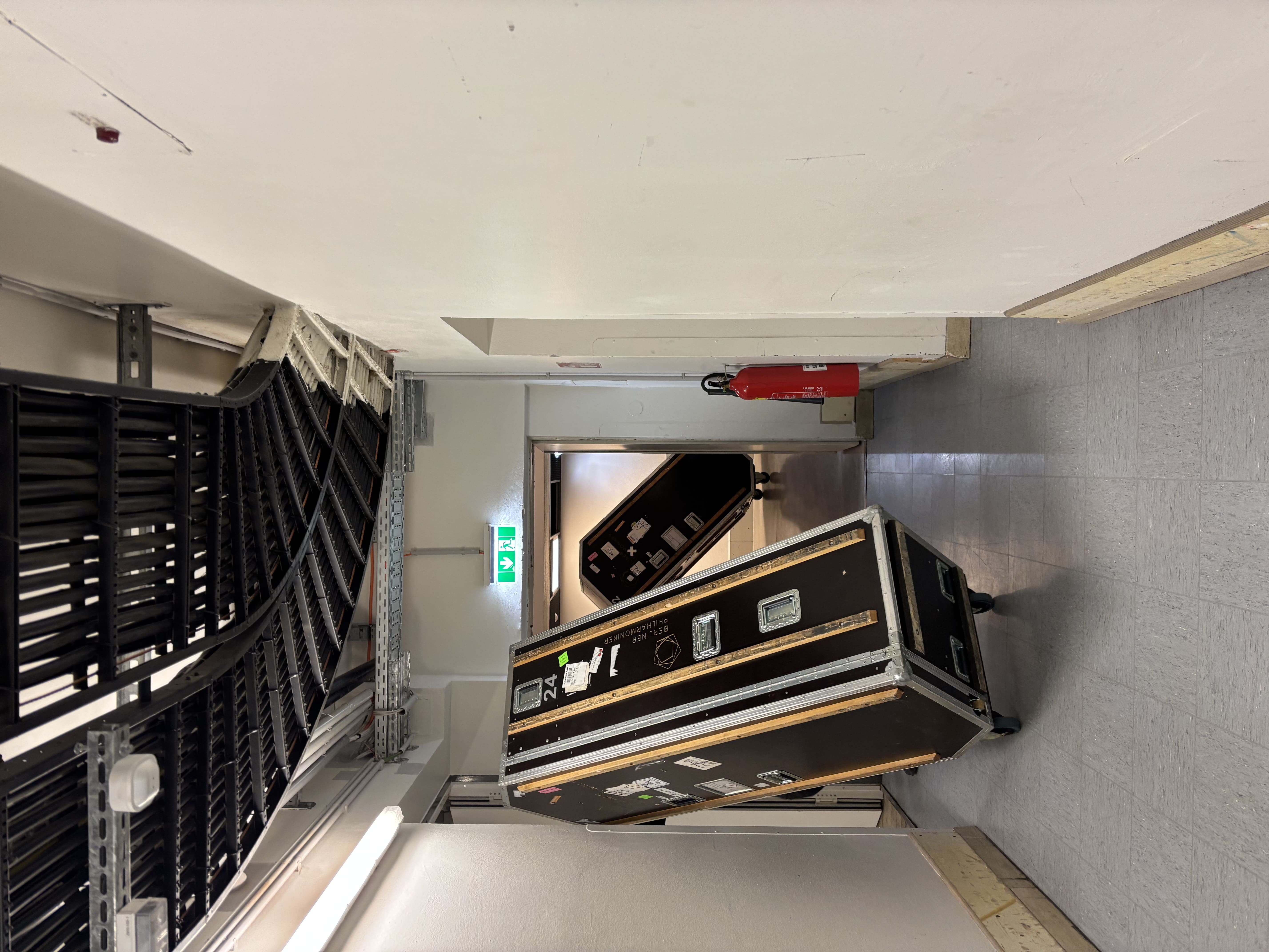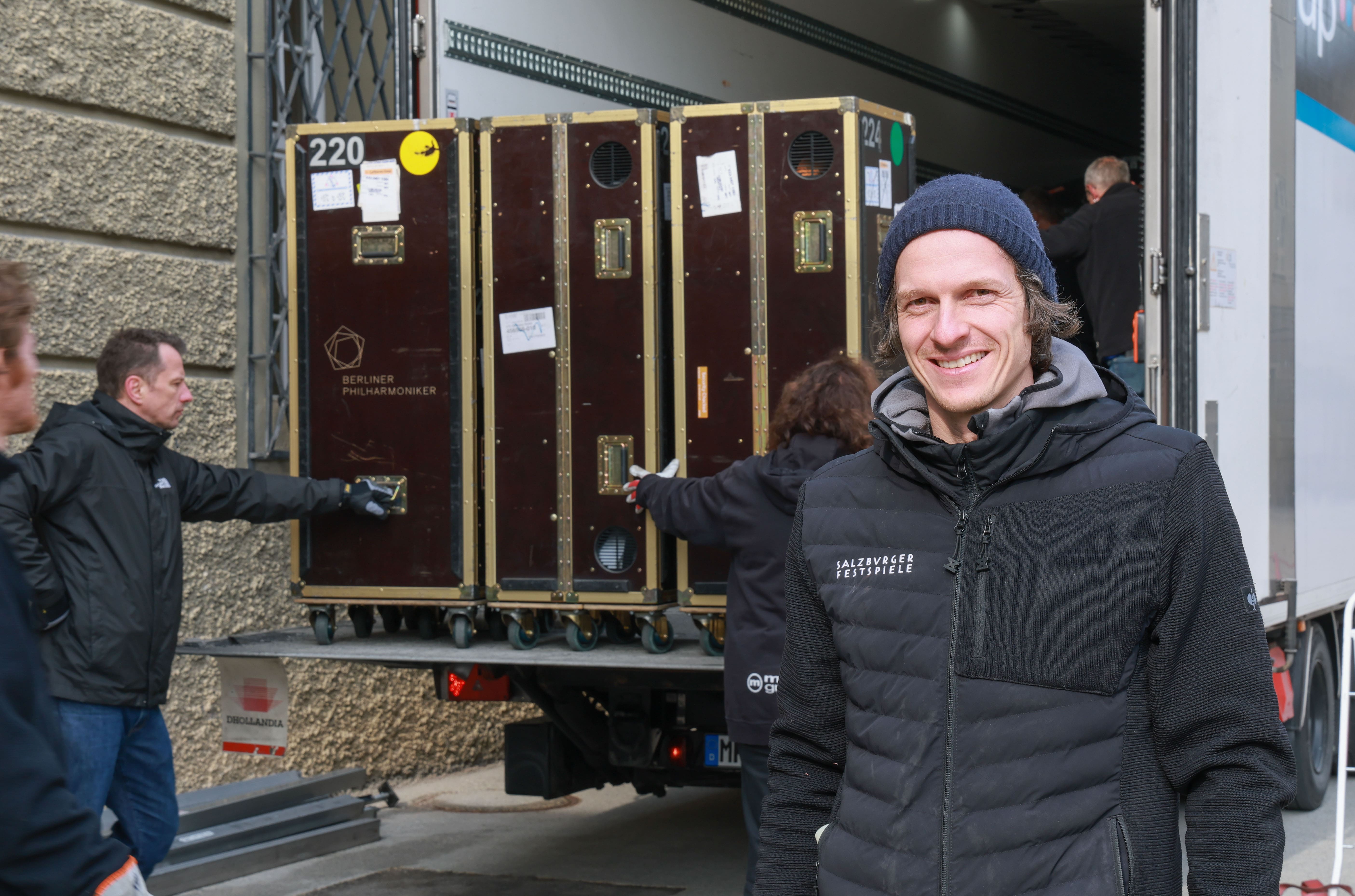 Bereits frühmorgens wird in der Hofstallgasse die „Ankunft der Berliner“ erwartet, so steht es auf dem Probenplan. Damit sind aber erstmal nicht die Philharmoniker selbst gemeint, sondern ihre Werkzeuge: die Instrumente. Andreas Christ empfängt mit seinem Technikteam des Festspielhauses drei große vollbepackte Lastwägen, die sich aneinandergereiht vorm Festspielhaus einparken. Es wird schnell eng und trubelig. So viele Instrumente sind selten auf einmal auszuladen – die Choreografie für die Kistenlogistik beginnt. Damit die wertvollen Instrumente sicher an die richtigen Stellen verladen werden, steht auch Orchesterwart Robert Buchwald zur Seite. Alles muss perfekt vorbereitet sein bevor die Musiker eintreffen und zu proben beginnen.